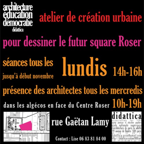 Attention, l’atelier de création urbaine pour l’élaboration du futur square Roser a lieu désormais tous les lundi de 14h à 16h dans les Algeco en face du centre Roser. Prochain atelier lundi 8 (…)
