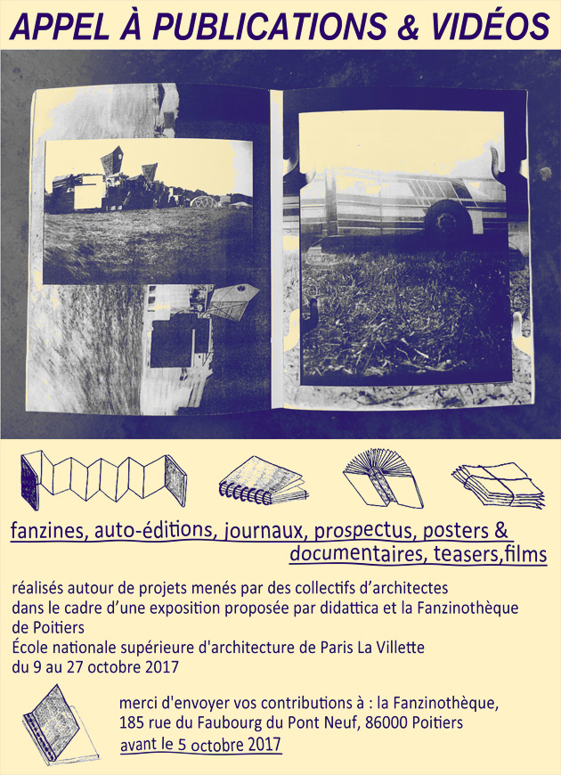 Exposition de micro-éditions crées autour de l’architecture, du paysage et de l’urbanisme, à l’Ecole d’Architecture de Paris La Villette, à l’initiative de didattica et de la Fanzinothèque de Poitiers.