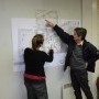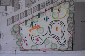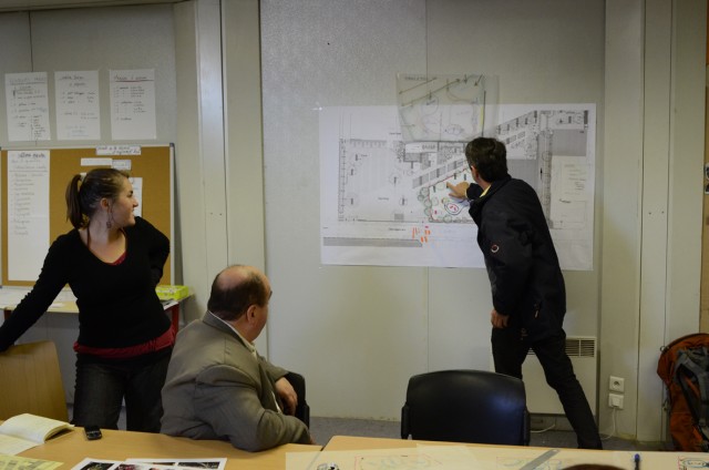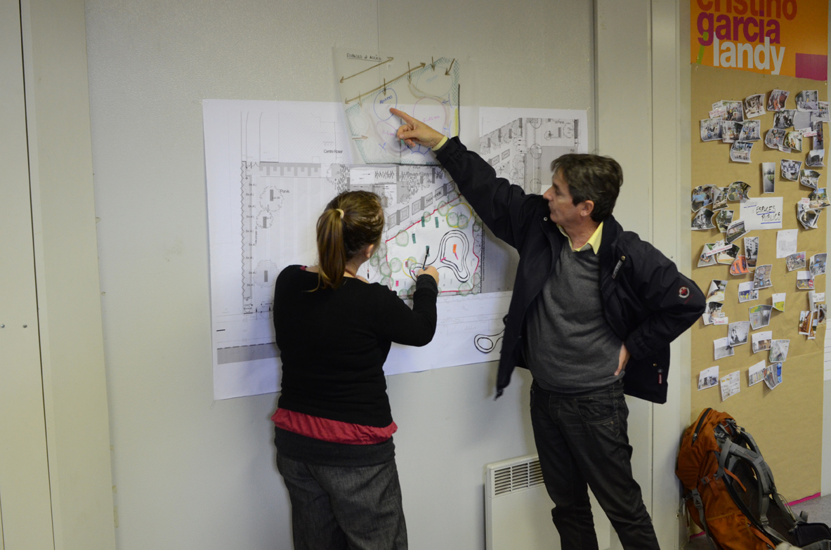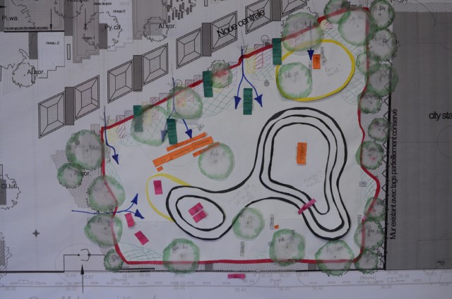 Il s’agira de procéder à la disposition des haies et du mobilier sur le site, en respectant quelques indications sur l’orientation des végétaux. Lise et Marc ont donc découpé tous ces éléments dessinés à l’échelle du plan, et invitent tout le monde à les y disposer.