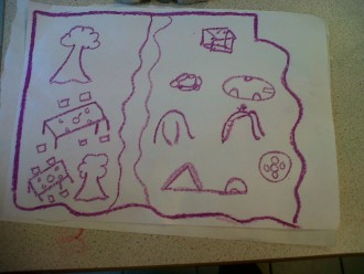 Cette fois-ci, chacun a suffisamment de temps pour expérimenter. Le dispositif est enrichi d’un vaste plan du futur square, tracé au pastel sur les tables regroupées. Les élèves ont disposé sur ce plan schématique leurs maquettes d’argile.