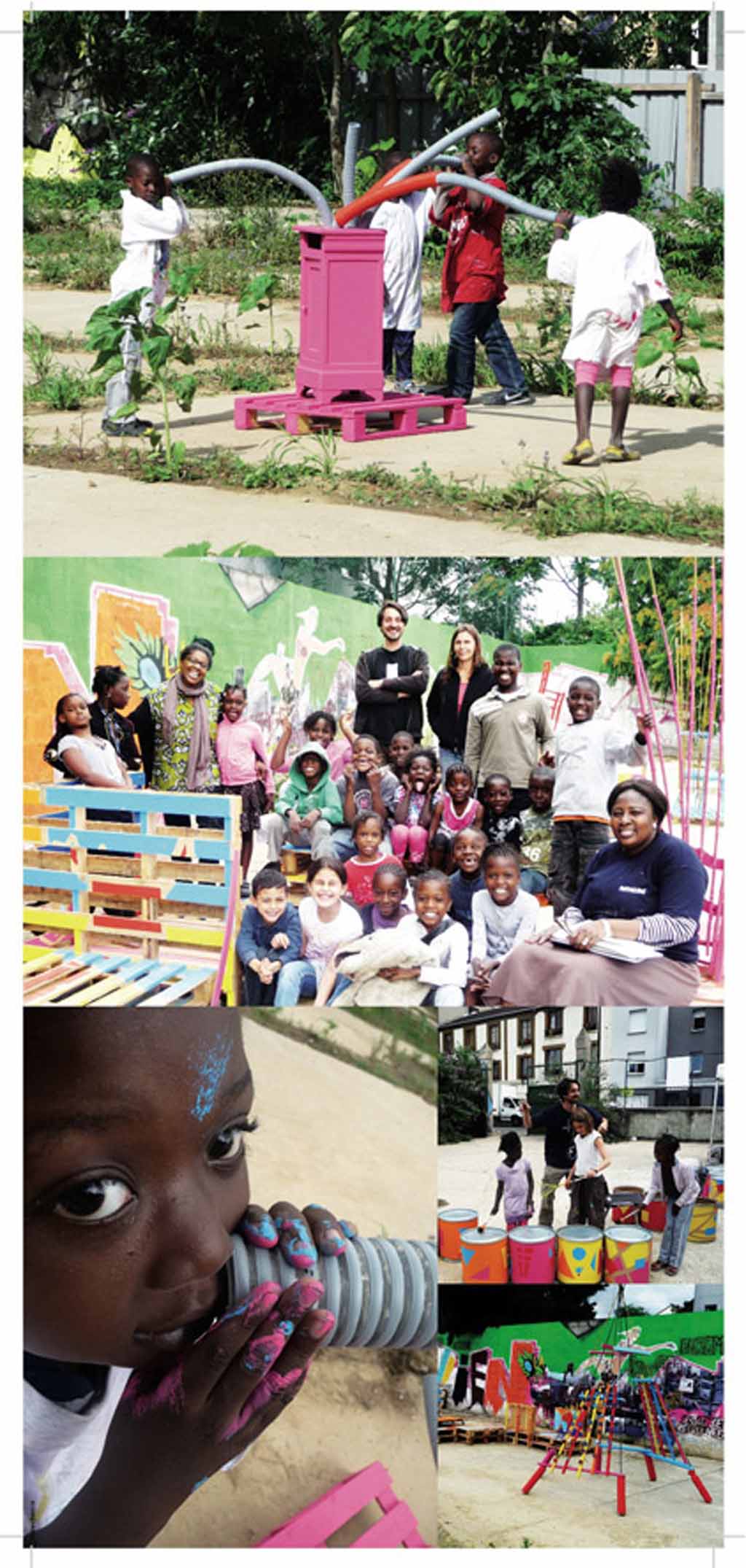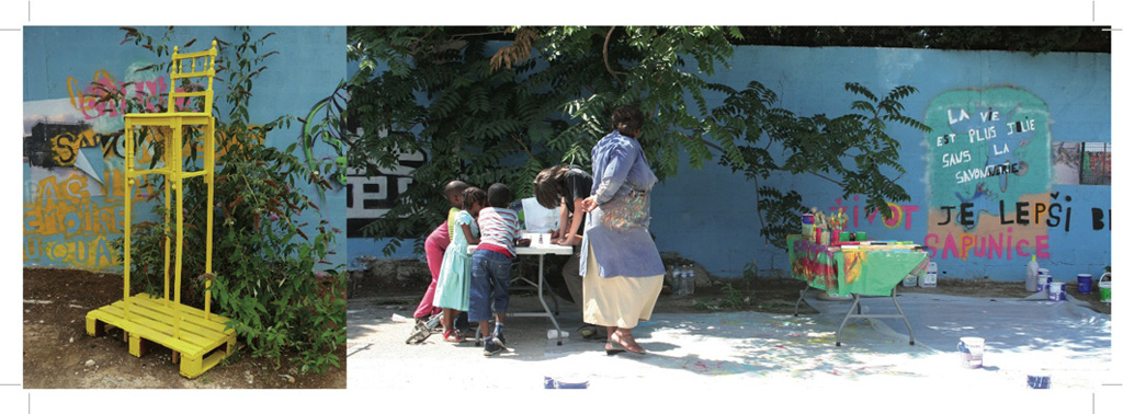 Deux séances ont tout d’abord été consacrées à la collecte de matériaux dans le quartier du Landy. Lors de la première séance, le 8 juin 2011, les Ambassadeurs du tri de Plaine Commune étaient présents pour sensibiliser les participants au tri des déchets, sous forme ludique. Ils ont aussi distribué quelques guides du tri et objets de sensibilisation et d’éducation. Ensuite, le groupe, composé d’une dizaine d’enfants et d’adolescents, et de deux adultes habitants, est parti faire le tour du quartier, à la recherche d’objets pouvant servir à la fabrication du mobilier.
