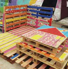 La deuxième séance a conduit les plus grands et les adultes à visser les palettes une fois sèches. Ainsi assemblées, le praticable était presque construit. Le nombre de participants a doublé entre la première et la deuxième séance. Les plus jeunes ont continué le travail de peinture des bidons. Les références artistiques ont été à nouveau présentées. Maintenant que les enfants de l’atelier ont commencé à réaliser le mobilier, ils comprennent mieux l’intérêt de se référer à des artistes. Suite à l’usage instinctif des enfants de la « causeuse », Auberfabrik décident de rajouter de la verticalité sur le parcours : mettre des palettes à la verticale, pour leur permettre de se cacher, de jouer entre eux… En parallèle, la médiathèque Paul Eluard a réalisé sa première séance de lecture en plein air, utilisant le mobilier fabriqué par le collège.