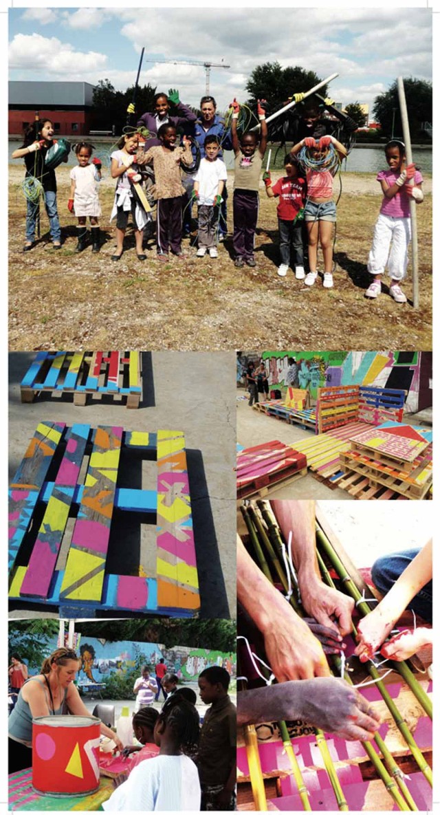 Le groupe se répartit en deux ateliers de peintures. Les plus jeunes sont affectés à celui des bidons sous les barnums et les autres sur des plastiques à même le sol un peu avant le parcours le long du mur de tag à l’ombre. Chacun est libre de choisir les couleurs et les motifs qu’il souhaite pour peindre. Cette première séance a réparti les enfants et les jeunes en deux groupes distincts en fonction de leur âge : les plus jeunes ont peint des bidons, les plus âgés ont peint des palettes en bois, qui avaient été disposées pour former un praticable. Le praticable, entièrement à base de palettes de bois, doit former le parcours. Deux jeunes d’Auber+ (association d’Aubervilliers qui propose à des jeunes de financer leur projet en échange de leur participation à des projets de la ville) ont participé à l’atelier.