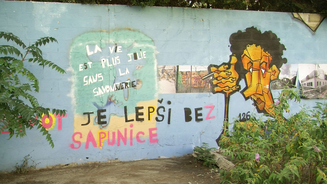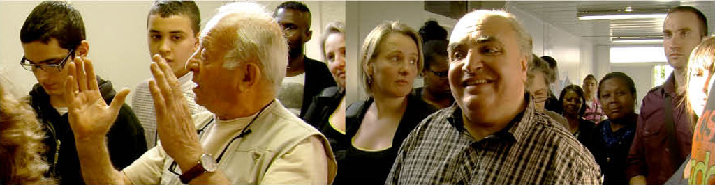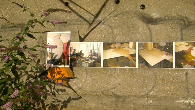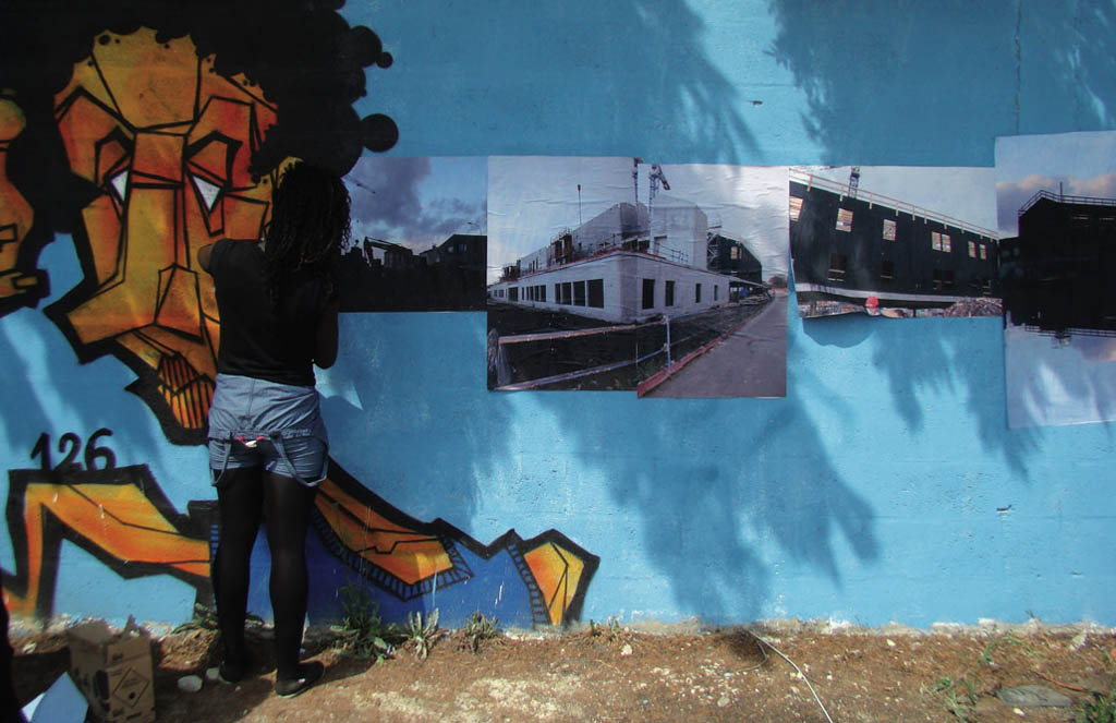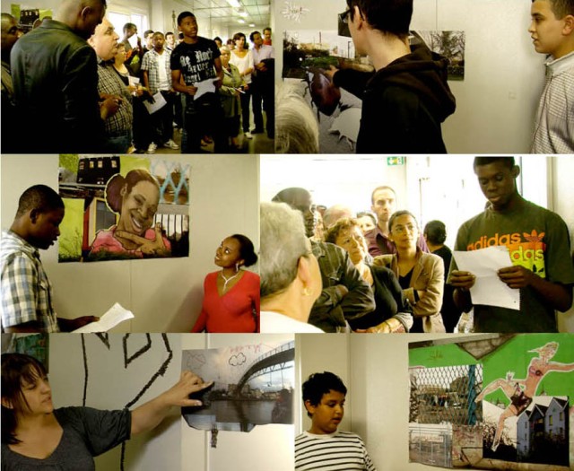 Certains élèves de la classe qui avaient terminé leur travail, ont graffé à la bombe des slogans préparés par l’ensemble des 3èmes du collège sur le sol devant l’algéco où devait se dérouler le conseil de quartier. En début de soirée, les élèves ont présenté leur photomontage devant une trentaine d’habitants du quartier dans l’algéco dédié aux réunions du conseil de quartier. Suite à cette présentation, les habitants ont posé des questions sur la démarche conduisant au travail et aux questions que pouvaient soulever les travaux des élèves.