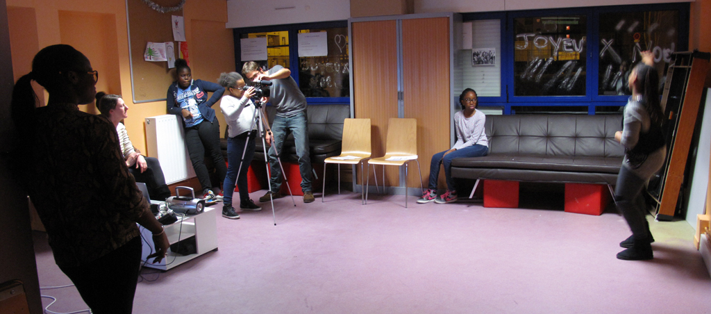 C’est dans la boite, Emilie filme ensuite le deuxième plan, un plan moyen. Pendant la mise en place, Aminata corrige Rose sur la danse car elle est partie du mauvais côté.