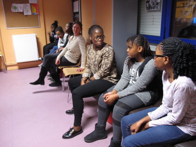 Aminata introduit la séance. Elle demande aux filles d’être attentives. Léa Longeot, qui avait animé seule la première séance, est aujourd’hui accompagnée de Felice et Antonia. Elle présente Antonia : « Elle est là pour tout noter et pour garder une mémoire de l’atelier. » A son tour, Felice se présente et explique brièvement le travail de cinéma qui est proposé en faisant un parallèle entre le travail du cinéaste et celui que font les filles avec Aminata. Il les questionne : « Quand vous préparez un spectacle vous faites tout d’un coup ? ». Rose répond : « Non, morceaux par morceaux. On part du pas de danse. » Il enchaîne : « C’est exactement comme cela que l’on fait en cinéma. On travaille des morceaux que l’on va assembler ensuite. ».