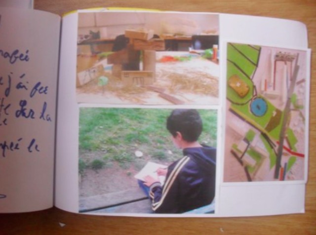 J’avais amené un livre « Tsiganes de Roumanie » pour montrer des photos des espaces qui font partie de leurs traditions et de leur culture. Ils m’ont expliqué qu’en Roumanie, ils ont de très belles maisons, et non pas des caravanes ou des cabanes. Ils m’ont montré les peintures qu’ils réalisent pour décorer leurs maisons et le travail à la main avec le fer. Ils m’ont ensuite désigné le marché, les pavés des trottoirs, les photos de mariage, et les fours qu’ils ont dans leurs maisons. Ils ont regardé l’ensemble du livre avec beaucoup d’intérêt. On a continué à regarder d’autres images mais cette fois des références d’aménagements d’espaces publics produits par des collectifs d’architectes "Le bruit du frigo" de Bordeaux et l’"Atelier d’Architecture Autogéré - AAA". J’ai expliqué que ce sont des projets participatifs d’architecture, avec des habitants. J’ai cherché à intégrer dans notre discussion sur ces aménagements, les questions de choix des matériaux. On a considéré un abri en bois utilisé aussi comme lieu de jeux, de sport et de réunions, et un jardin partagé ou encore une plage en centre urbain. On a remarqué un aménagement d’un espace public avec la création d’un abri : une boîte en carton.