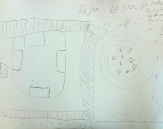 David, quant à lui, a dessiné un plan du déplacement de la barrière du parc tel que nous l’avions décidé pour profiter du lieu et du panorama qui, à l’heure actuelle, est gêné par cette clôture. Aussi, après avoir appris que la déchèterie allait être détruite par l’arrivée du tramway, David a voulu la réintroduire. Il a ainsi esquissé le plan la rue pour y accéder et la machine destinée au recyclage des matériaux. Il a représenté la rue et une petite maison en béton, et la machine en fer. Il a aussi réalisé le plan du cinéma plein air avec ses chaises et son écran.