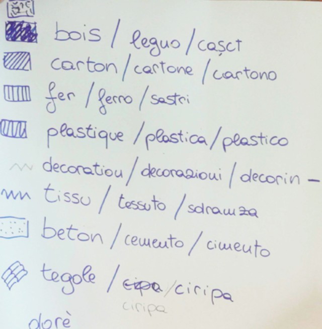 Nous avons approfondi et complété nos propositions formelles par des dessins de détails et une intégration des éléments à la maquette de la place. On y a ajouté les arbres avec les jeux que Salomon avait proposés, le cinéma, une cabine téléphonique, une chaise et le magasin de bonbons. Les enfants devaient choisir un élément particulier de leurs propositions faites dans la maquette de conception et l’étudier dans les détails en définissant les matériaux et les dimensions. On a introduit une légende des différents matériaux que l’on peut choisir en trois langues -français, italien et rromani- faute de se rappeler de certains mots en français.