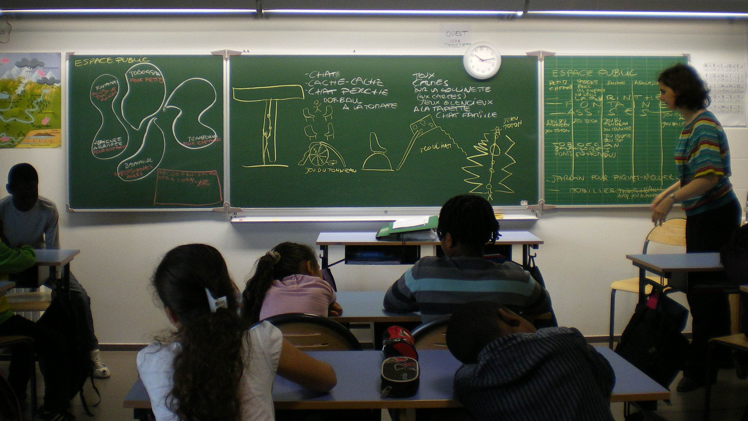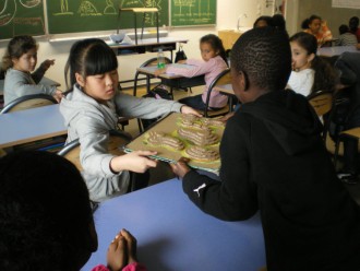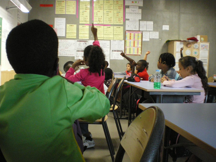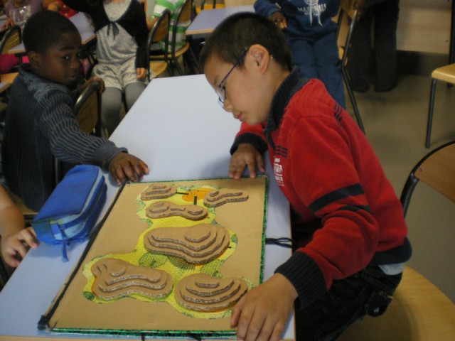 Difficile de rendre sensible, concret, l’espace du futur square Roser aux élèves de CE2 à partir d’un plan masse d’architecte. Alessandrat leur avait parlé des petites collines recouvertes de sol souple, imaginées par l’équipe de l’agence Hamelin. Les enfants connaissent bien ce type de sol, et en jetant un coup d’œil rapide par la fenêtre de la salle de classe, nous avions remarqué la présence d’une colline similaire. La séance commence donc par un commentaire rapide de l’une des maquettes en volume du futur square réalisée par Alessandrat. Comment les différentes collines pourraient-elles servir à différencier les espaces pour les petits, pour les personnes âgées, ou pour tout le monde ?