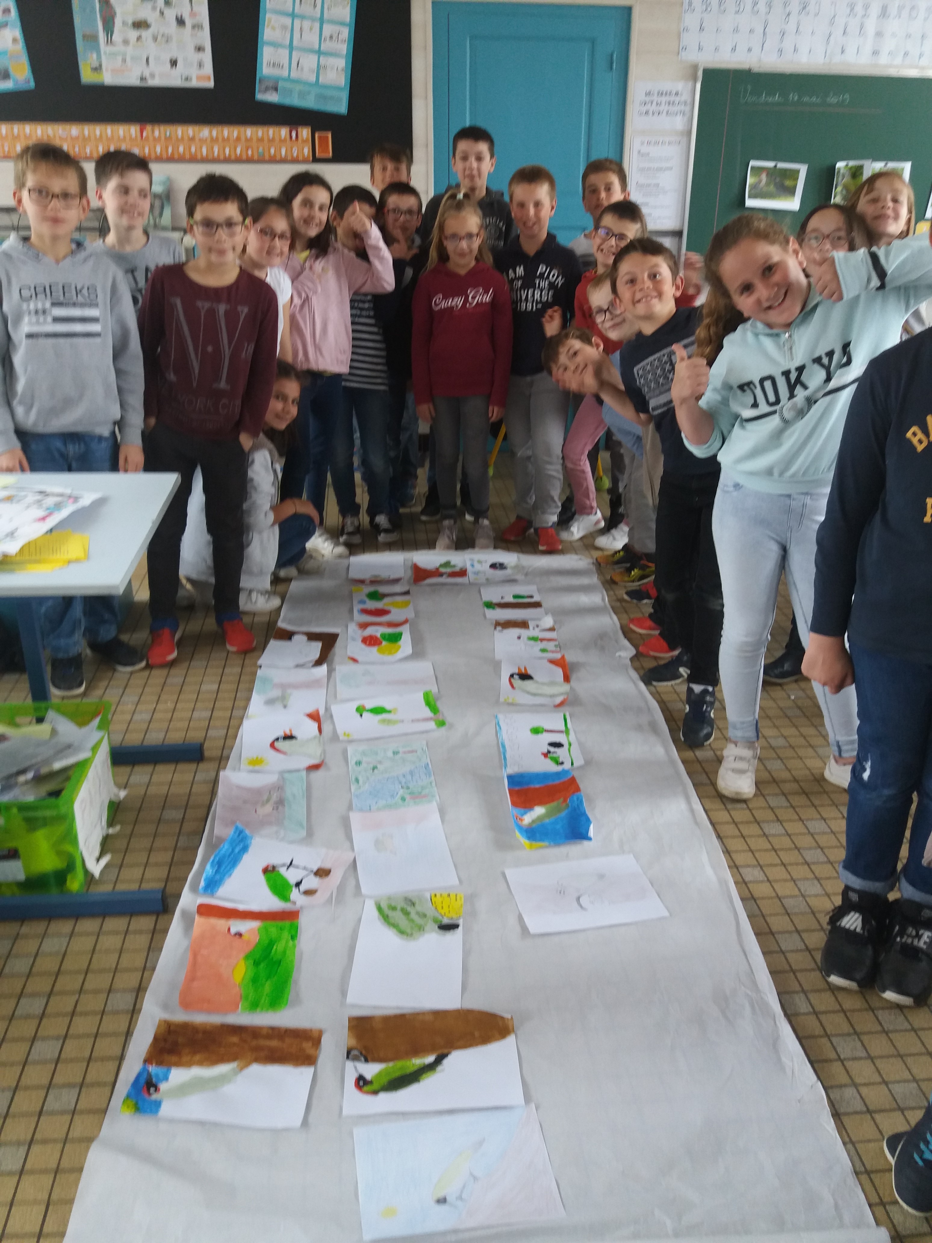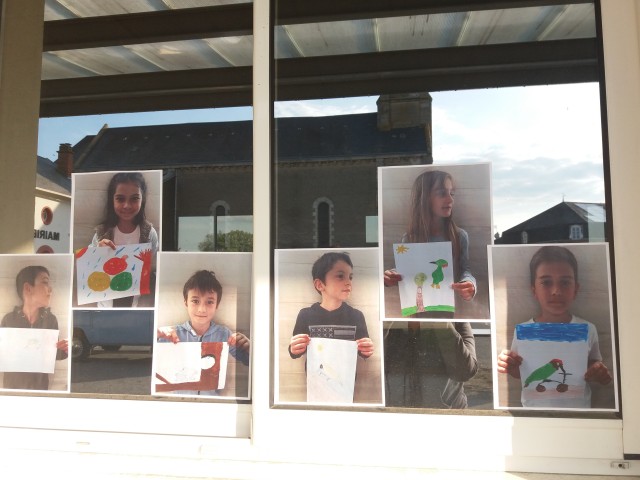 Les enfants ont été photographiés avec leur dessins de petits piverts et exposés sur les vitres de la salle des fêtes lors de la soirée du 22 mai 2019 de "conversation créative".