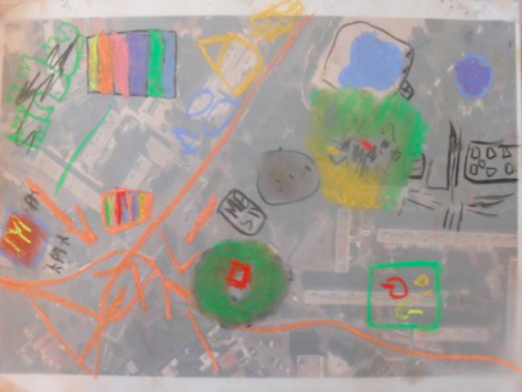 Afin de conduire les enfants à comprendre les dynamiques et enjeux du projet urbain sur le Haut de Montreuil et repérer les changements futurs dans la ville, munie de documents municipaux du projet où se situe le quartier des enfants au centre, j’ai présenté les grandes orientations urbanistiques prévues par la municipalité. Avec des photocopies des plans prévisionnels d’aménagement et des calques, j’ai invité les enfants à dessiner les limites de Montreuil et la partie où s’inscrit le projet urbain. Ils ont aussi localisé leur terrain, les grands axes de circulation, les parcs, le trajet du futur tramway...
