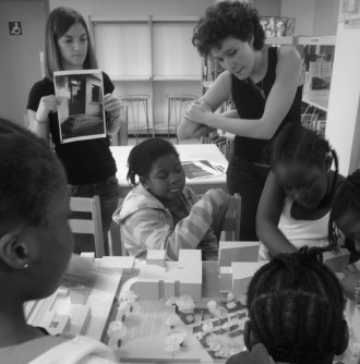 « Ah, elle est là, la maison de Michel ! ». Autour de la table, les filles observent, reconnaissent les lieux familiers, les lieux de l’histoire, . Elles sont fascinées de retrouver les lieux qu’elles pratiquent quotidiennement, représentés ici comme un jeu sur lequel on pourrait faire rouler des petites voitures et faire bouger des personnages. La maquette leur permet d’avoir une vue d’ensemble sur le quartier, de l’observer de « l’extérieur », et de faire le lien entre leur quartier et l’histoire qu’elles ont imaginée.