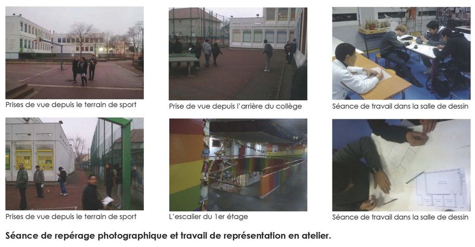 Monsieur Merah assistant à un conseil de discipline, je suis conduit à la salle de Francis Oudin (professeur d’arts plastiques), second enseignant responsable de l’atelier pédagogique. Me présentant brièvement à la classe (la 4ème C), je leur explique le métier d’architecte et le parcours à effectuer pour y accéder. Dans un second temps, nous présentons l’atelier d’architecture et leur proposons un exercice où ils donneront leur avis sur les choses qui leur plait, ou pas, dans leur collège. Il s’agit ensuite de faire jaillir des grands thèmes qui serviront à produire des idées directrices pour les groupes constituant l’atelier. Emergent les idées suivantes : démolition, escalators, salles plus grandes, couleurs plus harmonieuses, jacuzzi, miroirs dans les toilettes, créer une entrée, problème de chauffage et d’isolation des salles, plus de rangements.