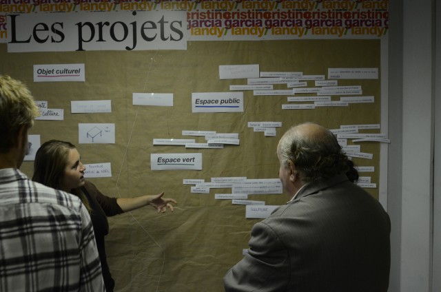 Quelques tables rassemblées, un grand plan du quartier tracé au mur, quelques photographies, un espace de documentation sur le Landy, un autre réservé au travail de l’atelier de Launay ou sur la notion d’espace public permet à chacun de se familiariser avec les enjeux du projet.