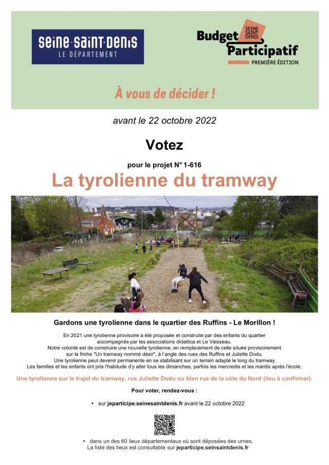 Nous avons besoin de votre soutien - Votez pour le projet déposé par Léa Longeot de didattica et validé par le département de Seine-Saint-Denis : garder une tyrolienne dans le quartier des Ruffins-Le Morillon.